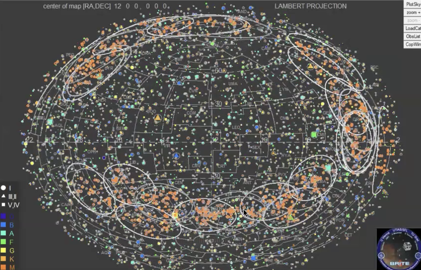 Jusqu’à aujourd’hui, la constellation BRITE a observé 753 étoiles dans 79 champs, parfois visités à plusieurs reprises. Les campagnes d’observations d’un champ cible se sont étendues parfois jusqu’à 6 mois et certains champs sélectionnés ont été revisités chaque année. L’étoile la plus brillante observée est Canopus (V = -0.72 mag) et la plus faible (HD96265 : V = 8.03 mag).